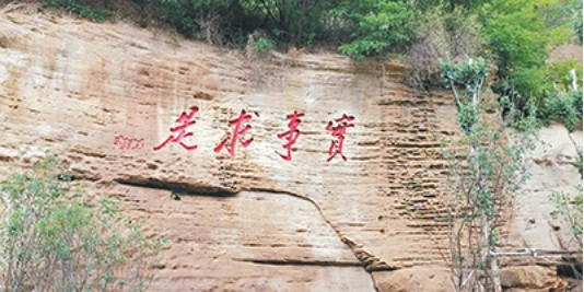 延安宝塔山的石壁上,毛泽东题词的“实事求是”熠熠生辉