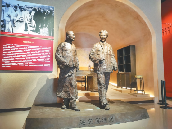 坐落于延安革命纪念馆的雕塑《延安窑洞对》