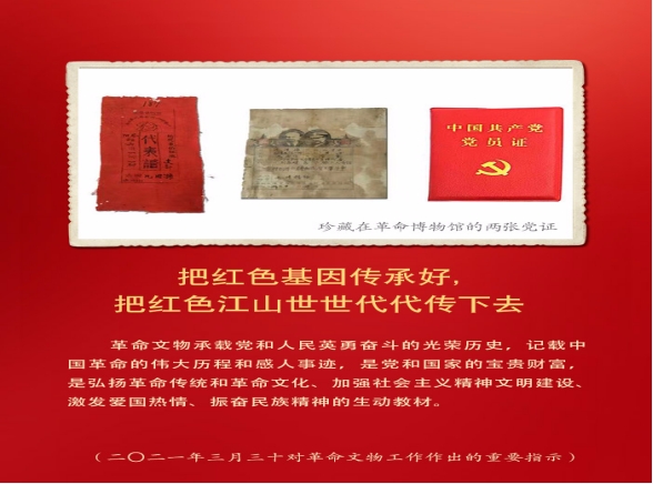 2021年3月30日,中共中央总书记、国家主席、中央军委主席习近平对革命文物工作作出的重要指示:“革命文物承载党和人民英勇奋斗的光荣历史,记载中国革命的伟大历程和感人事迹,是党和国家的宝贵财富,是弘扬革命传统和革命文化、加强社会主义精神文明建设、激发爱国热情、振奋民族精神的生动教材。”