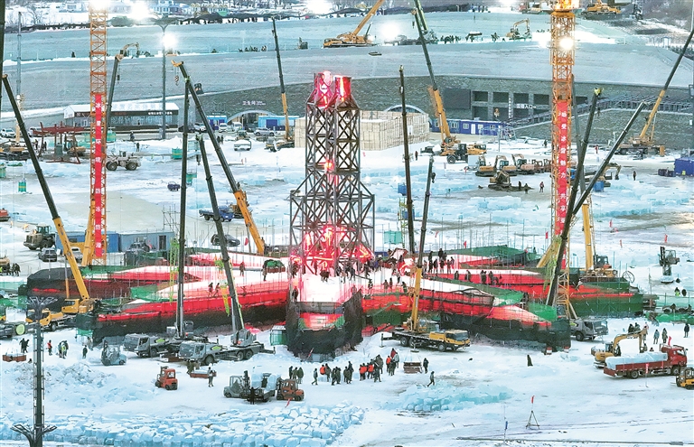 随着哈尔滨2025年第九届亚冬会的临近,东北地区冰雪季日益火爆。为满足游客多样化需求,推动冰雪经济新增长,哈尔滨不断升级冰雪旅游产品,打造消费新场景。图为近日,第二十六届哈尔滨冰雪大世界造雪工作已启动,园区雪雕建设同时进行,万名工人全力推进冰建雪景的建设。 图片来源:视觉中国