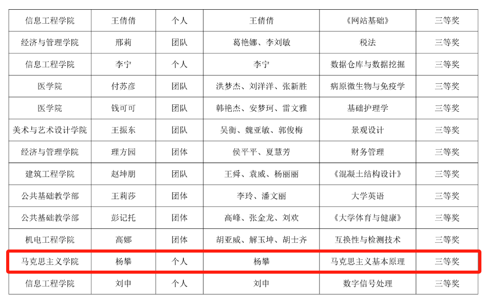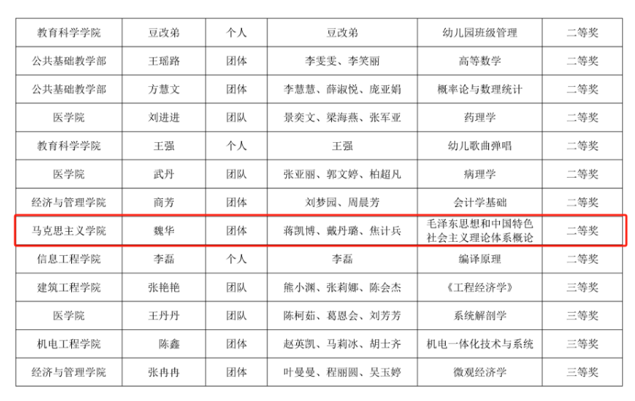 草长莺飞花满园,三月春风把喜报!在刚结束的本学期本科高校教师课堂教学创新大赛中,经过激烈的比拼和公正的评审,我院团队赛魏华戴丹璐焦计兵 蒋凯博四位教师荣获团队赛二等奖,杨攀荣获个人赛三等奖的好成绩。