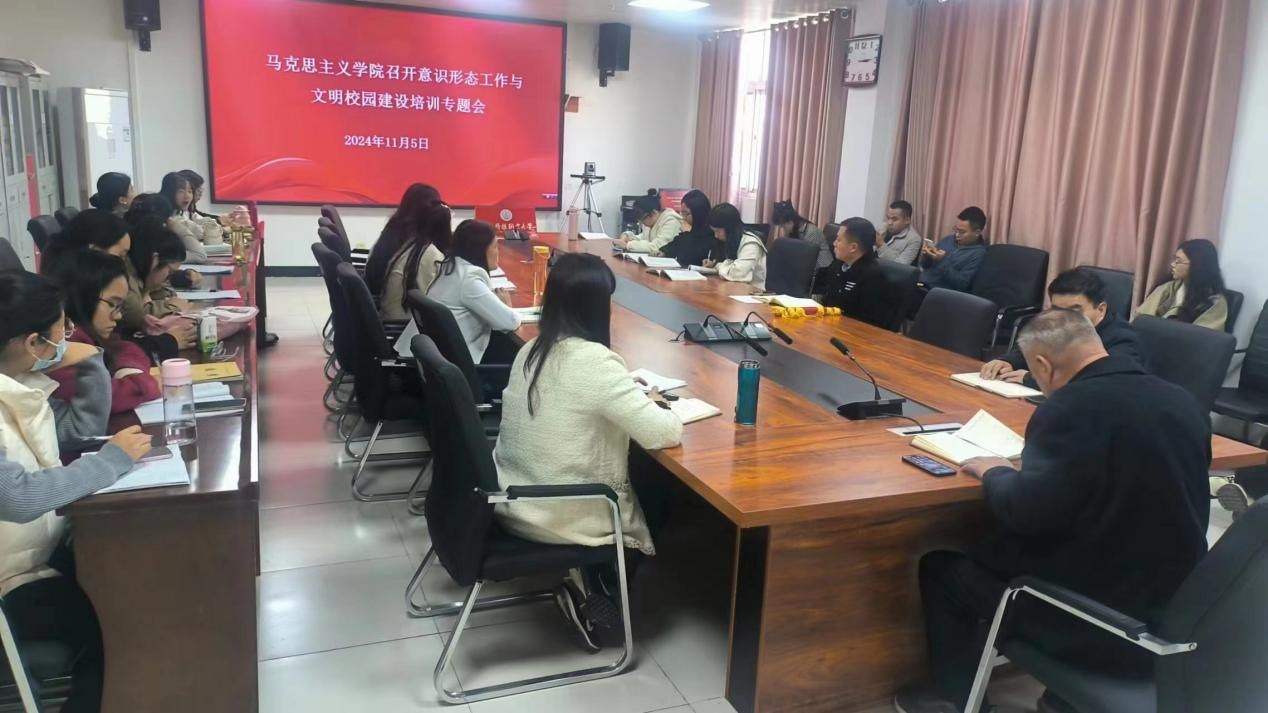 2024年11月5日下午3时,马克思主义学院在综合楼12楼会议室召开意识形态工作与文明校园建设培训专题会,院长徐金安、书记朱冰冰、副院长张西成及马院全体教师参会,此次会议由院长徐金安主持。