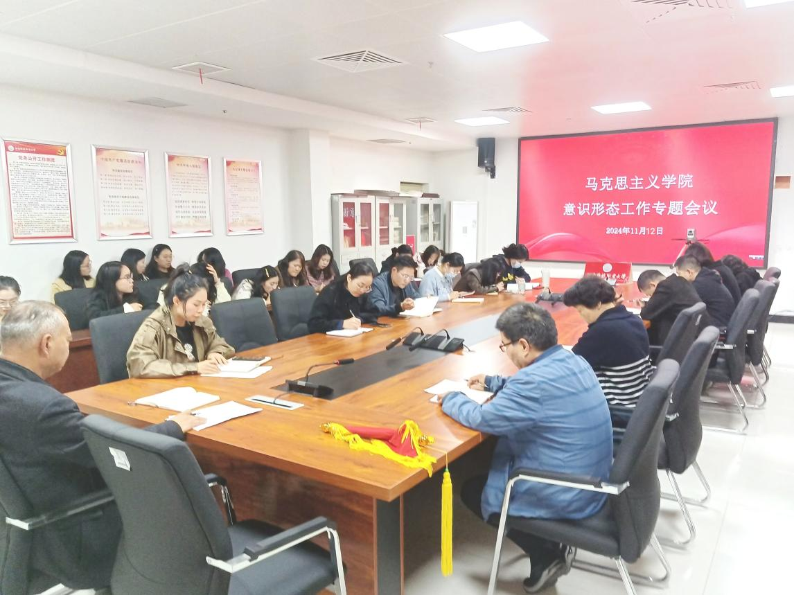 2024年11月12日下午3时30分,马克思主义学院在综合楼12楼会议室召开意识形态专题工作会议,院长徐金安、书记朱冰冰、副院长张西成及马院全体教师参会,此次会议由院长徐金安主持。