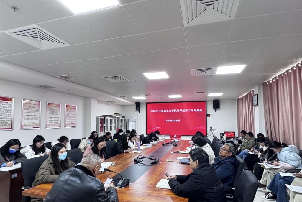 2025年2月25日下午14时,马克思主义学院在综合楼12楼会议室召开述法工作专题会,院长徐金安、书记朱冰冰、副院长张西成、副院长魏华及马院全体教师参会,会议由党总支书记朱冰冰主持。