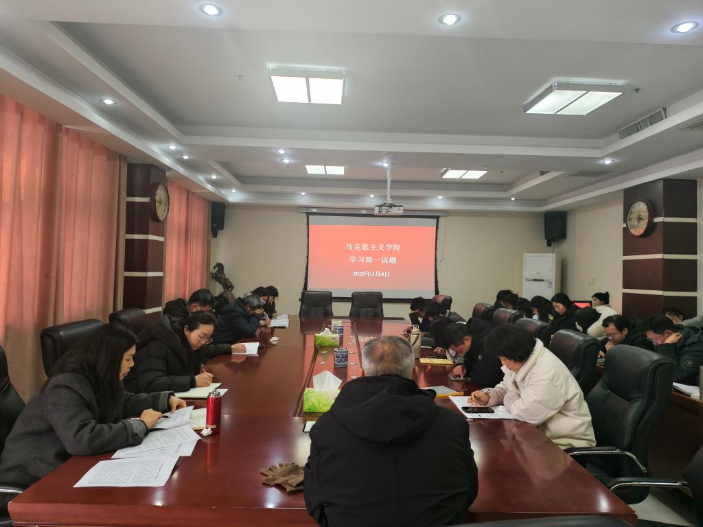 2025年3月4日17时,马克思主义学院在综合楼9楼会议室召开第一议题专题学习会,院长徐金安、书记朱冰冰、副院长魏华及全体教师参会,深入学习贯彻2025年全国教育工作会议精神。会议聚焦新时代教育高质量发展目标,动员全院教职工以实干担当推进教育强国建设。