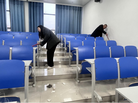 活动中,院领导与教师们手持工具分工协作,有的擦拭桌椅、清扫地面,有的整理投影设备、清理角落杂物。尽管春寒料峭,但现场热火朝天,大家以饱满的热情投入劳动,展现了高度的责任感和奉献精神。徐金安院长在劳动间隙强调:雷锋精神的核心是为人民服务,劳动教育是青年成长的重要课题。教师们要以身作则,引导学生将奉献精神融入日常学习与生活。