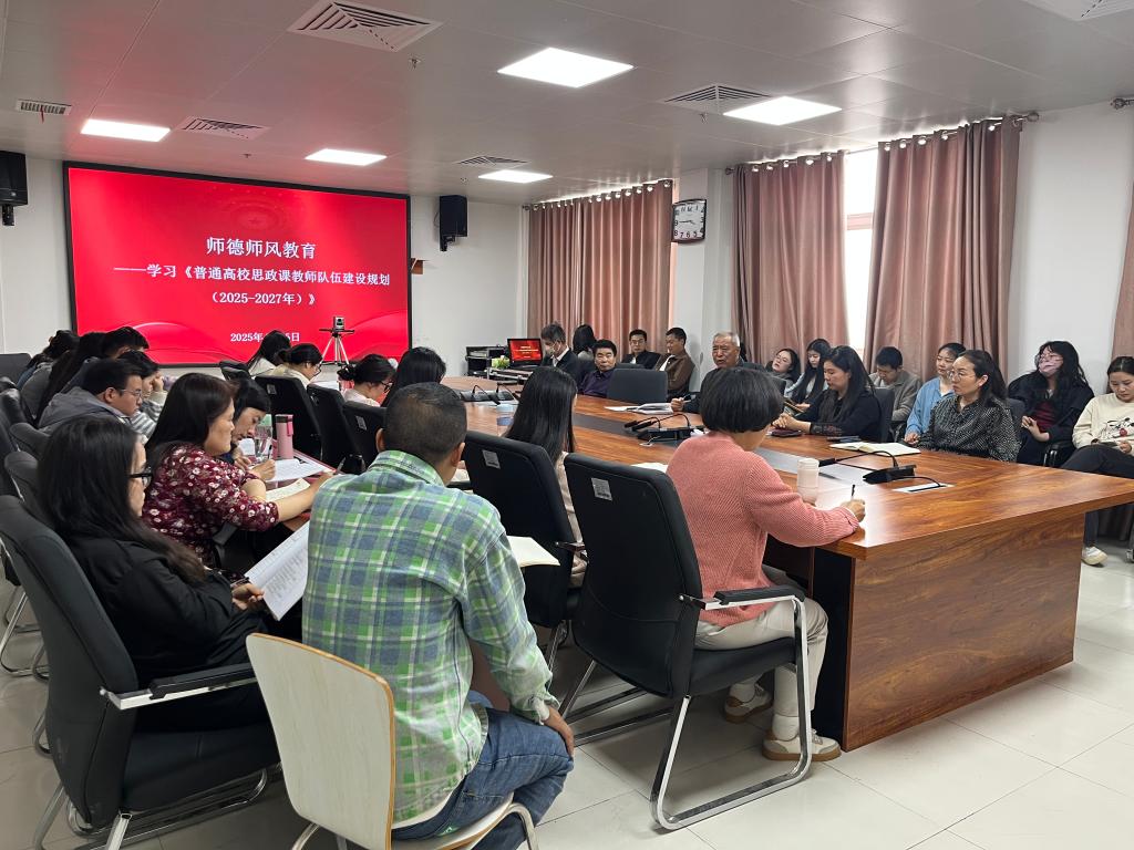 会上,徐金安院长首先传达学习了《普通高校思政课教师队伍建设规划(2025 - 2027年)》的文件精神,重点就提升教学能力,练就教书育人本领;进行科学研究,提升课堂教学学理化水平;建立教学优先评价体系,激发教师内生动力和师德师风教育监管等具体要求,进行了详细解读。并带领大家深入学习了《习近平总书记关于师德师风的重要论述摘编》,同时对文件进行了详细解读。