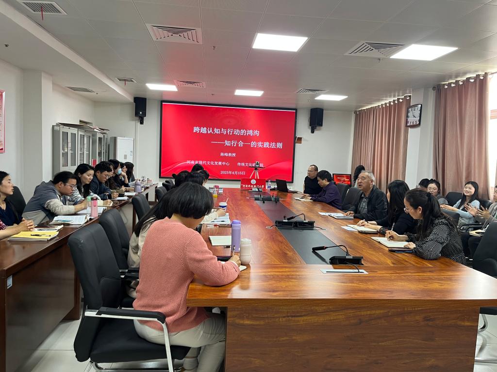 为深入学习领会习近平总书记关于“坚持把马克思主义基本原理同中华优秀传统文化相结合”重要论述的丰富内涵、精神实质和实践要求,全面深化对推进马克思主义中国化时代化规律性的认识,深刻领会以马克思主义为指导推动中华优秀传统文化创造性转化、创新性发展的使命任务和工作要求,2025年4月15日15时30分,马克思主义学院特邀河南省现代文化发展中心传统文化研究院陈峰教授在综合楼12楼会议室作“跨越认知与行动的鸿沟——知行合一的实践法则”专题讲座。讲座由马克思主义学院院长徐金安主持,全体教师参加学习交流。