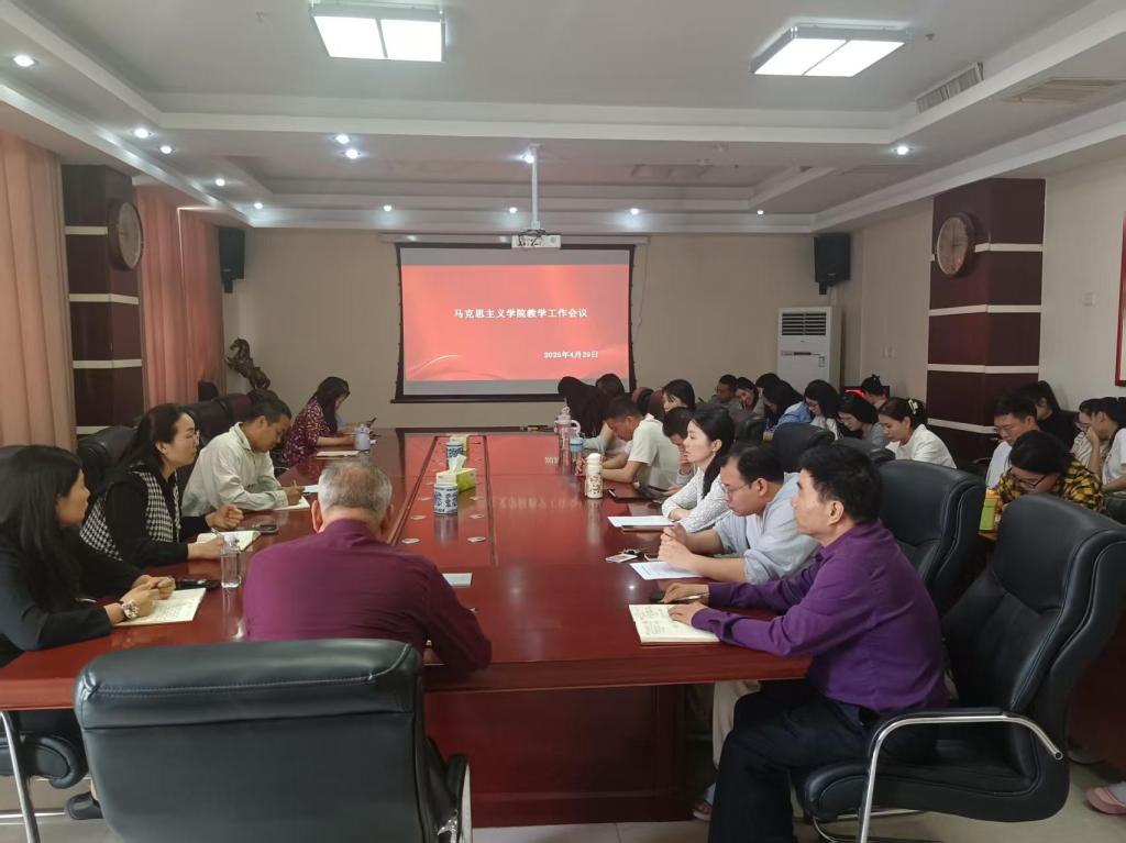 2025年4月29日15时30分,马克思主义学院在综合楼9楼会议室召开教学工作会议。院长徐金安、党委书记朱冰冰、副院长张西成、副院长魏华及全体教师参会,聚焦期中教学反思、课堂规范及特色课程建设等核心议题展开部署。