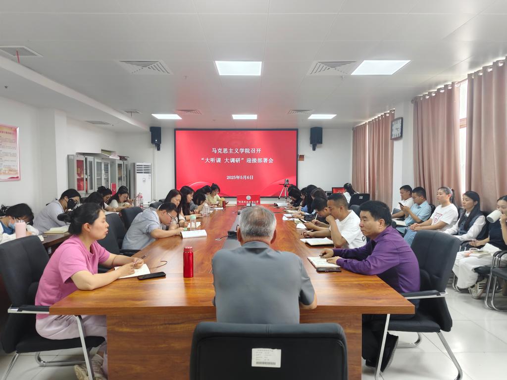 为深入学习贯彻习近平总书记关于思政课建设的重要指示精神,落实全国、全省新时代学校思政课建设推进会精神,按照《教育部办公厅关于开展 2024-2025 学年高校思政课课堂教学提升行动的通知》(教社科厅﹝2024﹞20 号)要求,2025年5月6日下午,马克思主义学院在综合楼12楼会议室召开了“大听课 大调研”迎接部署会。马克思主义学院院长徐金安、党总支书记朱冰冰、副院长张西成及全体教师参加会议。