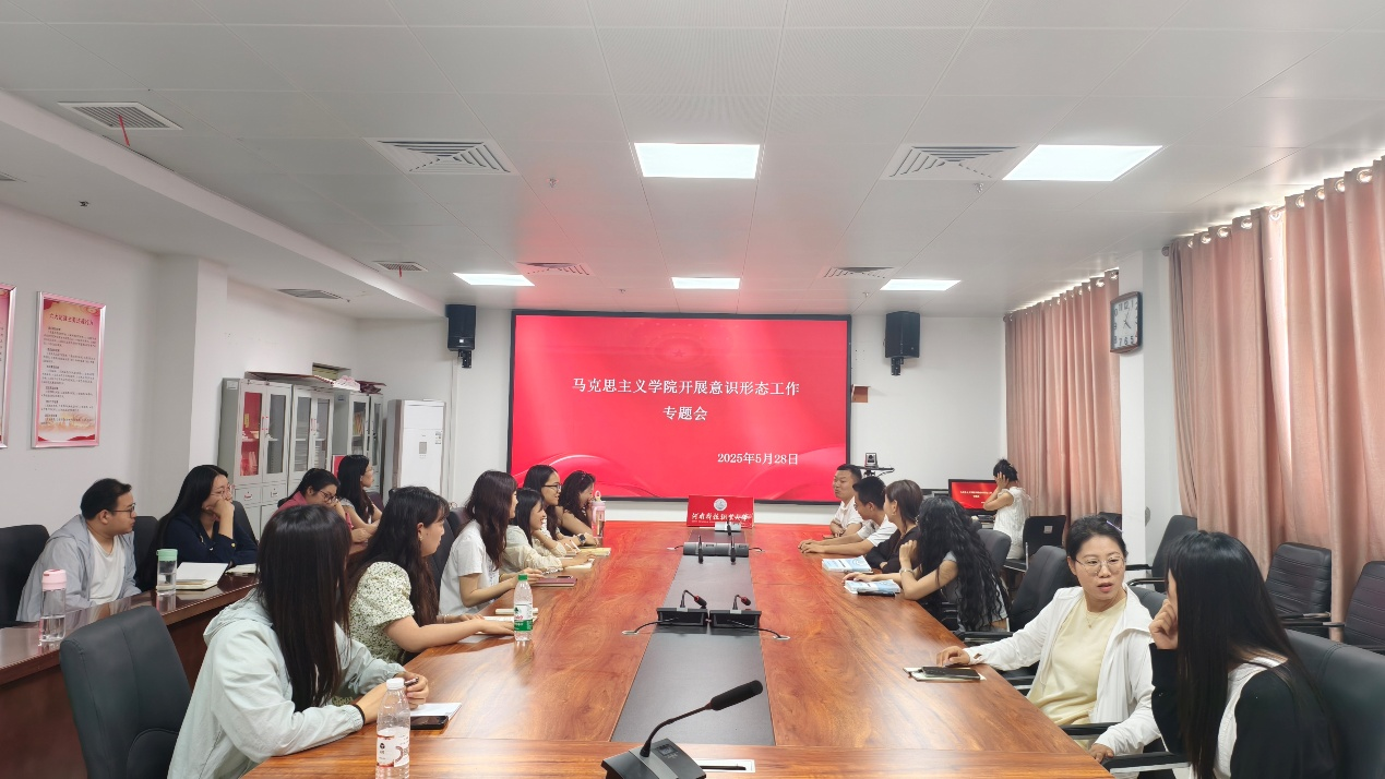 2025年5月28日下午3点30分,河南科技职业大学马克思主义学院在综合楼12楼会议室召开意识形态风险专题解读会,全体教师围绕学校《2025年第二季度(网络)意识形态工作风险研判报告》,深入剖析与学院职责密切相关的意识形态风险点,并就加强理论宣传引领、防范化解风险隐患展开研讨部署。