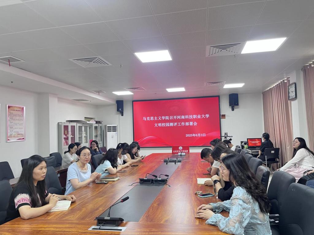 2025年6月3日下午3时,马克思主义学院在综合楼12楼会议室召开河南科技职业大学文明校园测评工作部署会。会议由学院党总支书记朱冰冰主持,党总支全体委员及相关教师参加会议。