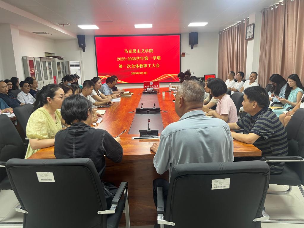为全面部署新学期工作,凝聚教职工力量,共同推动学院高质量发展,9月3日下午,马克思主义学院在学校综合楼12楼会议室召开2025-2026学年秋季学期第一次全体教职工大会,院长徐金安、学院党总支书记孟丽平、副院长魏华,学院全体教职工参加会议。会议由学院副院长张西成主持。