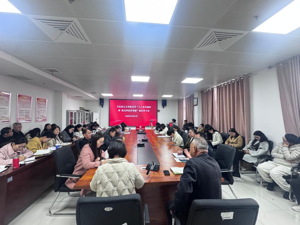 为进一步凝聚学院教师力量,以实际行动助力学校评估工作,10月21日下午,马克思主义学院在综合楼12楼会议室组织全体教师召开“人人争先做好事 我为评估做贡献”倡议学习会。会议由党总支副书记宋广锋主持,院长徐金安,党总支书记孟丽平,副院长魏华及全体教师参加活动。