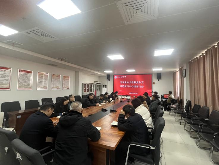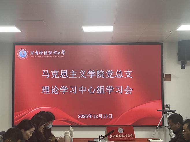 2025年12月15日,河南科技职业大学马克思主义学院党总支理论学习中心组在综合楼12楼召开专题学习会,深入学习领会党中央近期重要会议精神和有关决策部署。结合学院实际,就进一步加强新时代马克思主义学院建设、提升思想政治理论课教学质量、夯实立德树人思想根基进行深入研讨。徐金安院长主持会议,理论学习中心组全体成员参加学习。